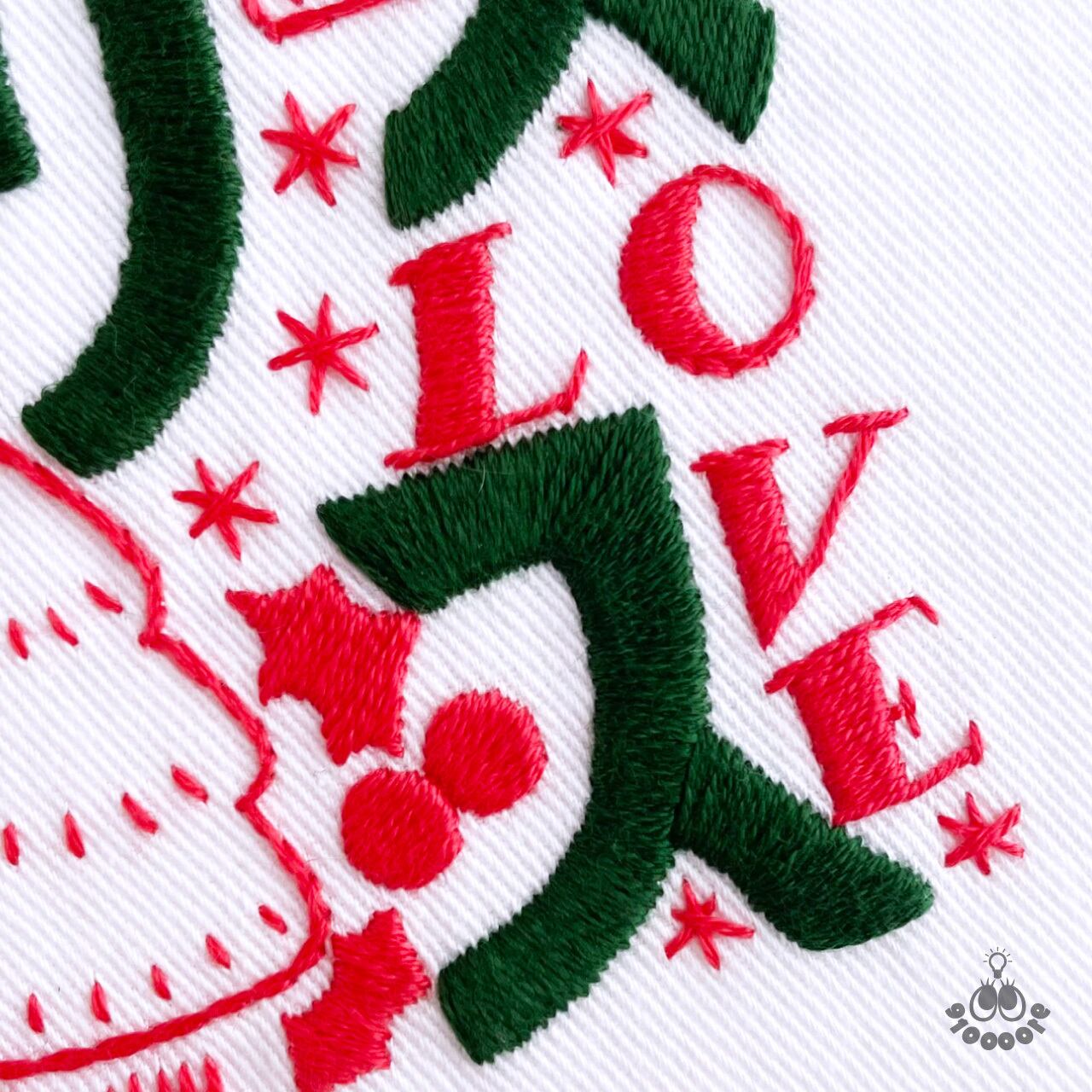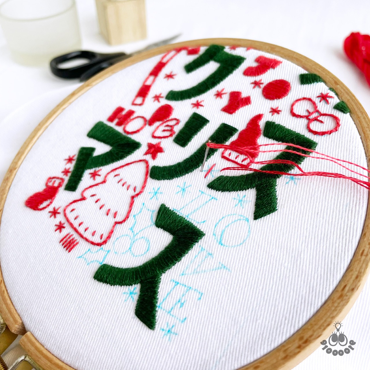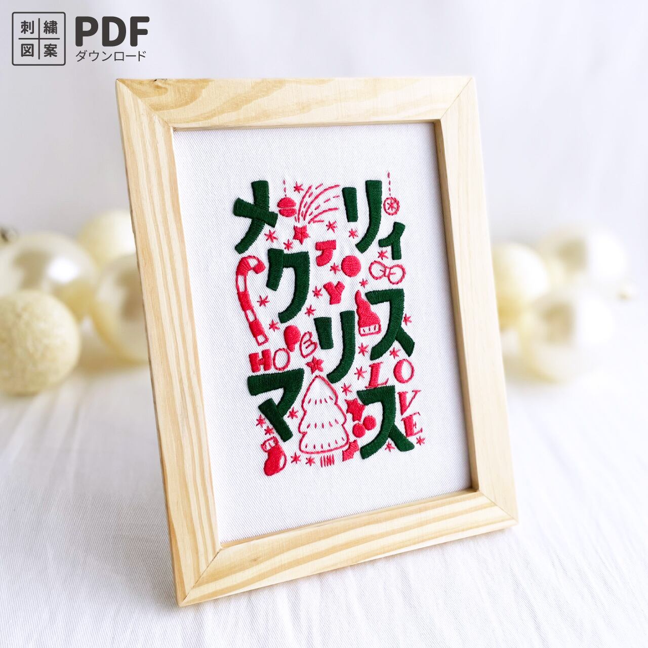 ポップなイラストと文字でクリスマスを楽しく表現した刺繍図案です。